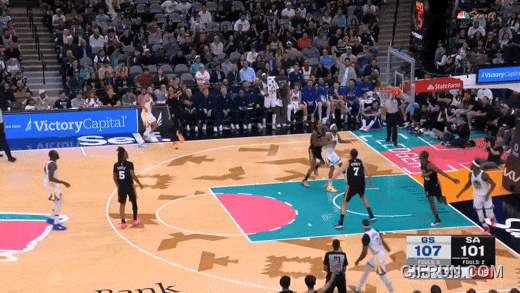 文班到三分线去追库里,被库里直穿篮下造罚球;瓦塞尔绕掩护细节不好,被库里要到三罚球:半节库里三个三分9个罚球,内外开花,马刺防守崩坏:
